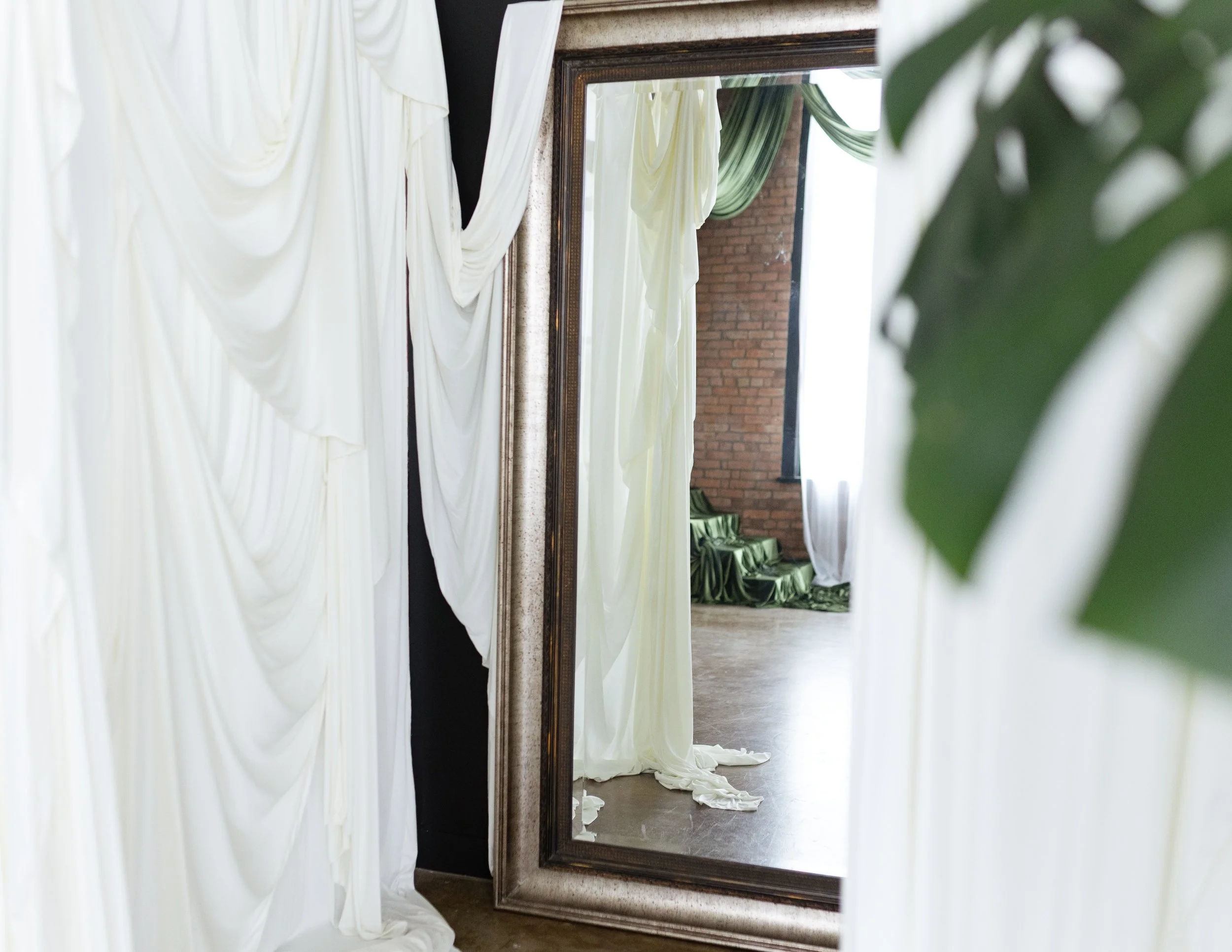 • A grand, oversized full-length mirror framed by soft ivory drapery, intentionally designed as a private changing and unveiling space for the bride to step into her wedding dress